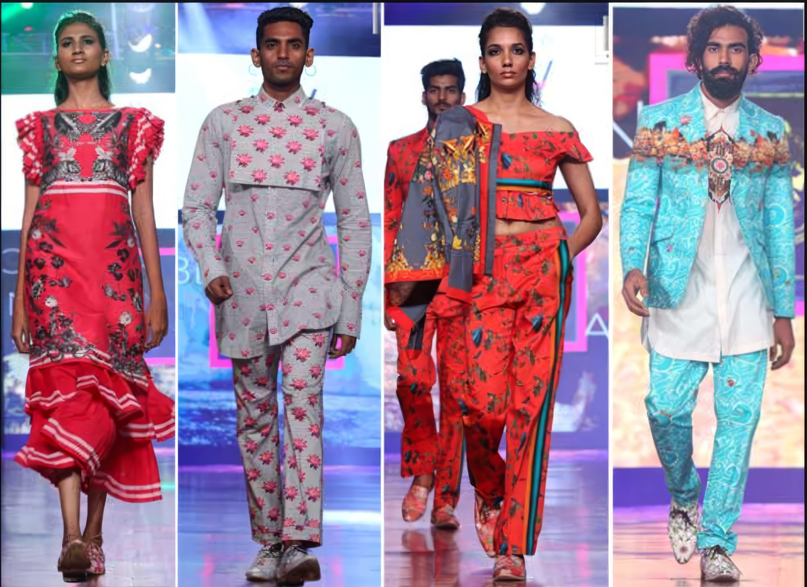 The presiding theme of Kumar’s Bhu-svah collection was print mixing and garments in different prints were styled together for an eclectic feel. Prints were also mixed within the same garment and the colour palette was rainbow bright. Menswear used traditional tailored silhouettes such as suit jackets and shirts but hot pants and draped t-shirts kept the audience on their toes.