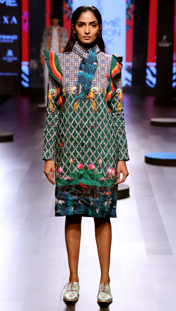 The sheer, fuchsia, embroidered, striped, belted, long-sleeved, dress was a fun garment that will work perfectly for a brunch. Peacock print trench coat with a white kurta, blouses, blazers, blousons, the final maxi and jacket in vibrant prints ended the show on a high note.