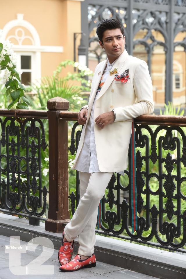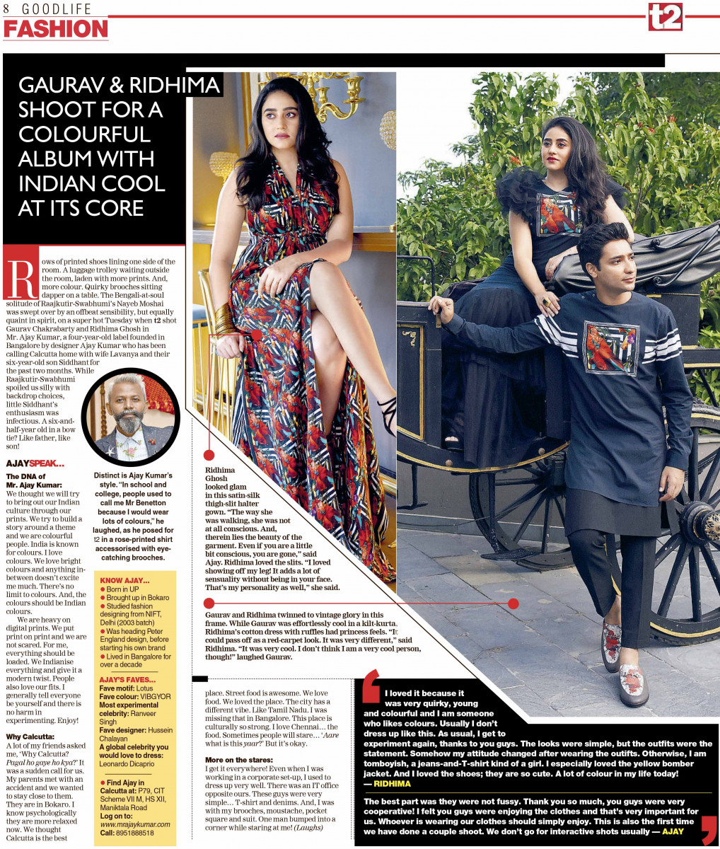 Rows of printed shoes lining one side of the room, laden with more prints. And more colour. Quirky brooches sitting dapper on a table. The Bengali-at-soul solitude of Raajkutir-Swabhumi’s Nayeeb Moshal was swept over by an upbeat sensibility, but equally quaint in spirit, on a super hot Tuesday when the shot Gaurav Chakrabarty and Ridhima Ghosh in Mr. Ajay Kumar, a four-year-old label founded in Bangalore by designer Ajay Kumar who has been calling Calcutta home with wife Lavanya and their six-year-old son Siddhant for the past two months. While Raajkutir-Swabhumi spoiled us silly with backdrop choices, little Siddhant’s enthusiasm was infectious. A six-and-half-year old in a bow tie? Like father, like son!