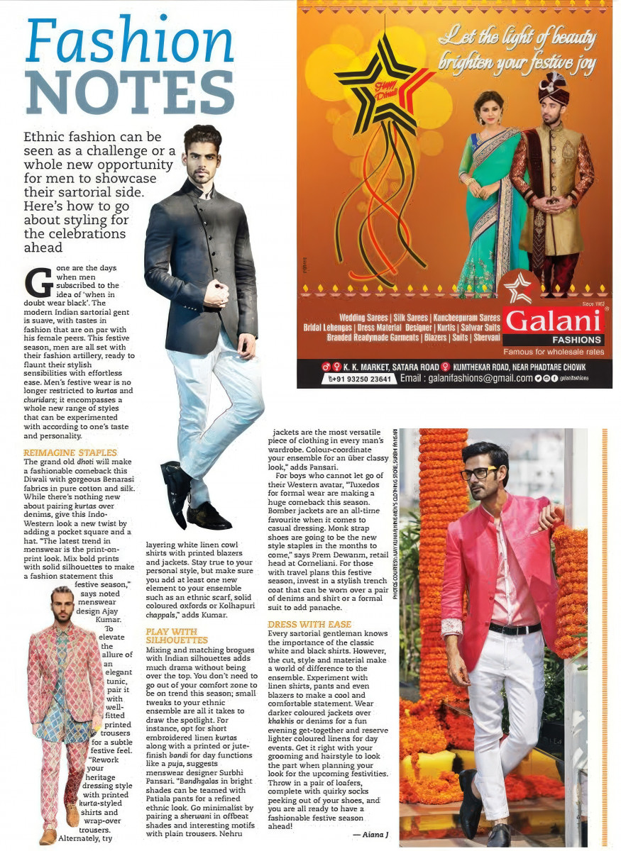 The grand old dhoti will make a fashionable comeback this Diwali with gorgeous Benarasi fabrics in pure cotton and silk. While there is nothing new still about pairing kurtas over denims, give this Indo-Western look a new twist by adding a pocket square and a hat. “The latest trend in menswear is the print-on-print look. Mix bold prints with solid silhouettes to make a fashion statement this festive season,” says noted menswear designer Ajay Kumar.