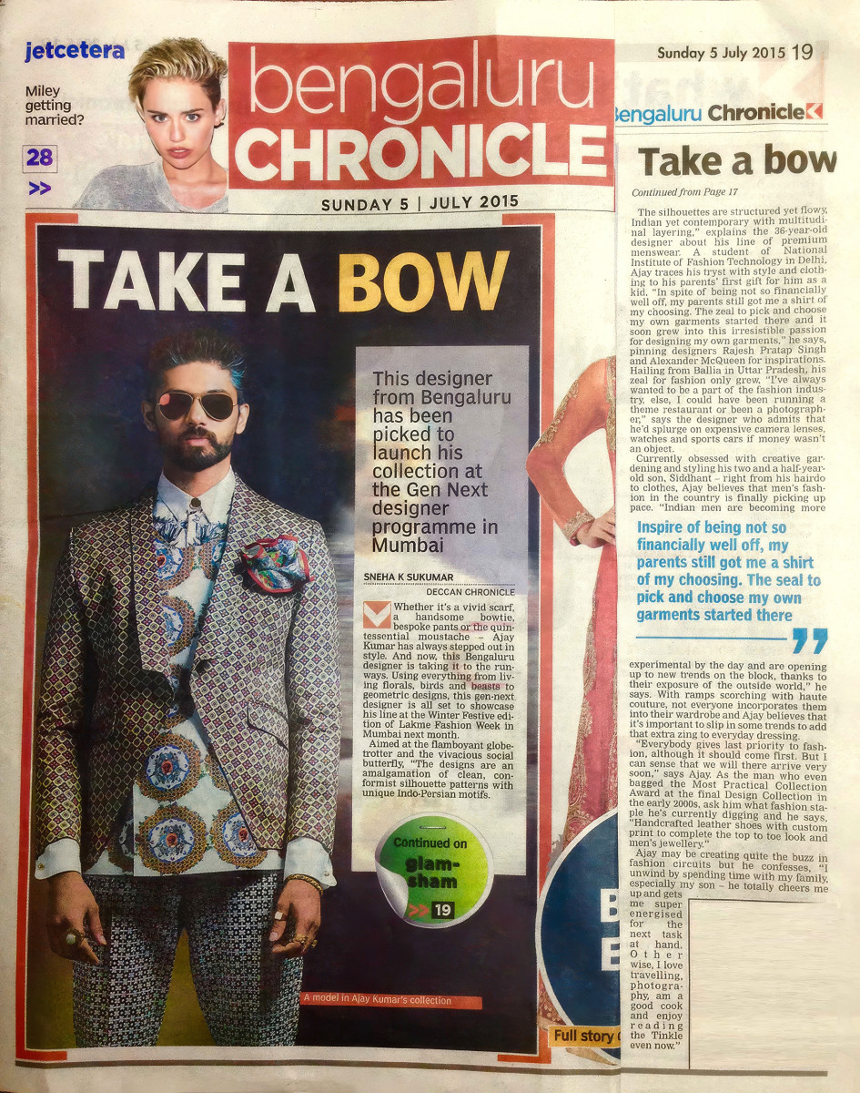 Whether it’s a vivid scarf, a handsome bowtie, bespoke pants or the quintessential moustache – Ajay Kumar has always stepped out in style. And now, this Bengaluru designer is taking it to the runways. Using everything from living florals, birds and beasts to geometric designs, this gen-next designer is all set to showcase his line at the Winter Festive edition of Lakme Fashion Week in Mumbai next month.