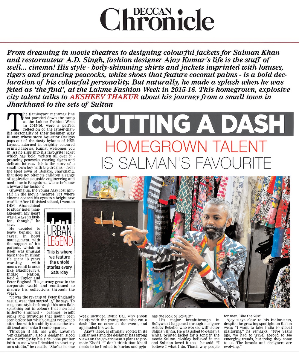 From dreaming in movie theatres to designing colourful jackets for Salman Khan and restaurateur A.D. Singh, fashion designer Ajay Kumar’s life is the stuff of, well... cinema! His style - body-skimming shirts and jackets imprinted with lotuses, tigers and prancing peacocks; white shoes that feature coconut palms - is a bold declaration of his colourful personality. But naturally, he made a splash when he was feted as ‘the find’, at the Lakme Fashion Week in 2015-16. This homegrown, explosive city talent talks to AKSHEEV THAKUR about his journey from a small town in Jharkhand to the sets of Sultan.