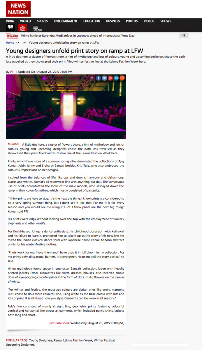 Inspired from the balances of life, like ups and downs, harmony and disharmony, blacks and whites, Kumar's all menswear line was anything but dull. The sumptuous use of prints accentuated the looks of the male models, who sashayed down the ramp in their colourful attires, which mostly consisted of pantsuits. "I think prints are here to stay. It is the next big thing. I know prints are considered to be a very spring summer thing. But I don't see it like that. For me it is for every season and you would see me using it a lot. I think prints are the next big thing," Kumar told PTI. His prints were edgy without looking over-the-top with the employment of flowers, elephants and other motifs.