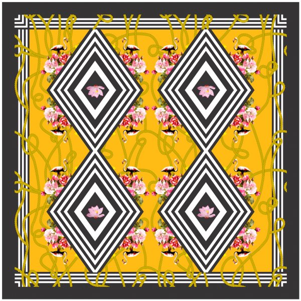 The Yellow Diamond scarf features the organic movement of marine life along with stripes, chains, ropes and anchors in addition to the bold diamond at the centre with the signature lotus.
